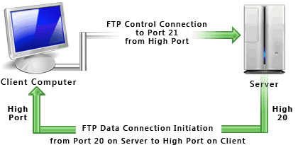 Seperti halnya sebagian besar hubungan klien-server lainnya, mesin klien membuka koneksi ke server pada port tertentu dan server kemudian merespon klien pada port tersebut. Ketika sebuah klien FTP terhubung maka server FTP membuka koneksi ke port kontrol FTP 21.